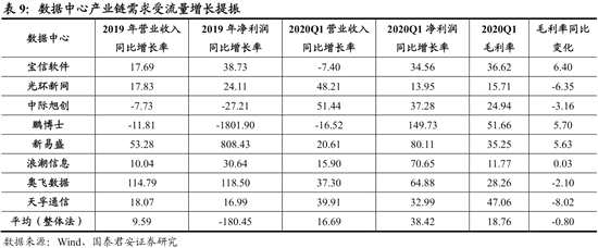 數(shù)據(jù)中心產(chǎn)業(yè)鏈需求受流量提振,景氣度有望長期維持高位。我們選取的8家數(shù)據(jù)中心產(chǎn)業(yè)鏈公司2020Q1營收同比增長17%,扣非凈利潤同比增長38%。在線上辦公、線上交易、游戲等需求提振下,數(shù)據(jù)中心需求顯著提升。IDC行業(yè)的光環(huán)新網(wǎng)、寶信軟件,上游設備和光器件公司浪潮信息、中際旭創(chuàng)等均盈利較快增長。隨著海外云計算巨頭資本開支增速提升,阿里等國內(nèi)互聯(lián)網(wǎng)巨頭推出資本開支計劃,國家大力推動5G和數(shù)據(jù)中心等新基建,數(shù)據(jù)中心產(chǎn)業(yè)鏈景氣度有望長期維持高位。