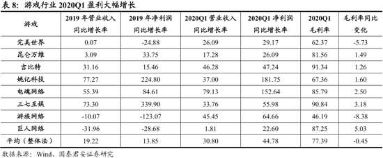 游戲行業(yè)2020Q1盈利大幅增長,5G仍將驅(qū)動云游戲快速發(fā)展,龍頭受益顯著。我們選取的8家游戲公司2020Q1營收同比增長31%,扣非凈利潤同比增長45%。在居民居家時間延長的情況下,游戲行業(yè)需求明顯提升,全行業(yè)盈利大幅增長。隨著5G在2020年進入大規(guī)模建設期,網(wǎng)絡基礎(chǔ)設施改善將提高AR和VR等技術(shù)的效果,推動云游戲快速發(fā)展,游戲龍頭優(yōu)勢將更加突出,受益更顯著。