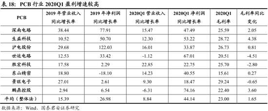 PCB行業(yè)2020Q1盈利增速較高,疫情對Q2盈利沖擊較大,疫情好轉(zhuǎn)后5G建設、數(shù)據(jù)中心和消費電子將拉動行業(yè)景氣回升。我們選取的8家PCB公司2020Q1營收同比增長8%,扣非凈利潤同比增長44%。疫情前PCB行業(yè)景氣度較高,我國主要公司2020年初在手訂單飽滿。5G產(chǎn)業(yè)鏈的滬電股份、深南電路,消費電子產(chǎn)業(yè)鏈的東山精密、鵬鼎控股盈利增速均較高。PCB行業(yè)海外占比較高,Q2盈利存在一定不確定性。由于PCB為定制化生產(chǎn),不同公司下游存在較大差別,景氣也將有所差異。但隨著5G、數(shù)據(jù)中心建設加快,及只會遲到不會缺席的5G換機潮到來,PCB行業(yè)整體景氣度有望較快回升。