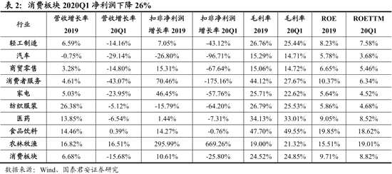 消費板塊2020Q1凈利潤下降26%,農(nóng)林牧漁、食品飲料、醫(yī)藥行業(yè)盈利增速相對較高。我們將食品飲料、家電、汽車、輕工制造、紡織服裝、商貿(mào)零售、醫(yī)藥、消費者服務、農(nóng)林牧漁等產(chǎn)品需求與終端消費景氣度相關(guān)性較高的行業(yè)歸為消費板塊。2019年消費板塊營業(yè)收入同比(整體法)增長6.7%,2020Q1下降15.7%。消費板塊2019年扣非凈利潤同比增長10.6%,2020Q1下降25.8%。消費板塊2020Q1毛利率較2019年提升0.3個百分點,盈利能力平穩(wěn)。分行業(yè)看,20Q1農(nóng)林牧漁、食品飲料、醫(yī)藥行業(yè)盈利增速相對較高,消費者服務、汽車、商貿(mào)零食行業(yè)盈利下滑較多。