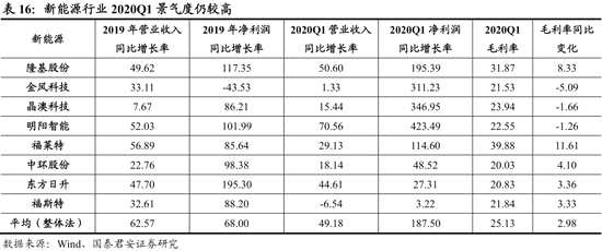 新能源行業(yè)Q1高景氣,盡管Q2海外沖擊較大,光伏與風電行業(yè)景氣有望快速恢復。我們選取的8家新能源行業(yè)公司2020Q1營收同比增長49%,扣非凈利潤同比增長188%。受益于全球平價上網(wǎng)區(qū)域擴大,及政策擾動下2019Q1低基數(shù),隆基股份、中環(huán)股份等光伏龍頭2020Q1盈利快速增長,【明陽智能(601615)、股吧】、金風科技等風電龍頭受益于搶裝潮和盈利低基數(shù)。光伏行業(yè)海外占比高,但疫情難擋平價上網(wǎng)導致的行業(yè)快速發(fā)展趨勢,海外疫情好轉(zhuǎn)后景氣將快速回升。風電行業(yè)受益于搶裝潮,年內(nèi)有望維持高景氣。