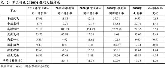 軍工行業(yè)2020Q1盈利快速增長,軍改后訂單恢復正常、改革加速、地緣政治等將推動行業(yè)穩(wěn)健增長。我們選取的8家軍工公司2020Q1營收同比增長11%,扣非凈利潤同比增長80%。軍工行業(yè)需求受疫情影響非常有限,且行業(yè)特殊性使得企業(yè)保障生產(chǎn)的能力在疫情沖擊下得到體現(xiàn)。從行業(yè)景氣周期看,軍改影響的訂單加速釋放,“十三五”最后一年裝備加速交付使景氣度維持高位。長期看,地緣政治影響及裝備現(xiàn)代化需求將使行業(yè)長期處于穩(wěn)健增長中。催化角度,2019年以來股權(quán)激勵與頻率加快,改革有望加速推進。因此軍工行業(yè)高景氣仍可維持。