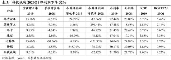 科技板塊2020Q1凈利潤下降32%,國防軍工、電子、電力設備行業(yè)盈利增速相對較高。我們將電子、通信、計算機、傳媒、電力設備、國防軍工等產(chǎn)品具有較高技術(shù)含量的行業(yè)歸為科技板塊。2019年科技板塊營業(yè)收入同比(整體法)增長8.6%,2020Q1下降7.4%??萍及鍓K2019年扣非凈利潤同比增長11.9%,2020Q1下降32.4%。科技板塊2020Q1毛利率與2019年基本持平。分行業(yè)看,20Q1國防軍工、電子、電力設備行業(yè)盈利增速相對較高,計算機、通信、傳媒行業(yè)盈利下滑較多。