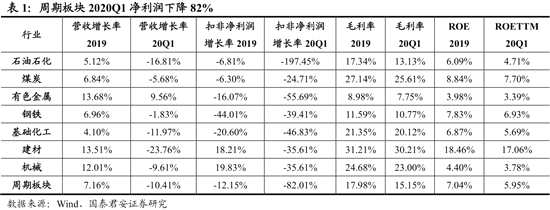 周期板塊2020Q1凈利潤下降82%,煤炭、機械、建材行業(yè)盈利增速相對較高。我們將石油石化、煤炭、有色金屬、鋼鐵、基礎(chǔ)化工、建材、機械等產(chǎn)品價格或銷量受宏觀經(jīng)濟影響較大的行業(yè)歸為周期板塊。2019年周期板塊營業(yè)收入同比(整體法)增長7.2%,2020Q1下降10.4%。周期板塊2019年扣非凈利潤同比下滑12.2%,2020Q1下降82%。
