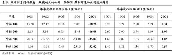 2020Q1權(quán)重股盈利增速更高,盈利能力也更強。我們以成分股無重疊的中證系列指數(shù)的盈利表現(xiàn)衡量規(guī)模與盈利的關(guān)系。2020年Q1中證100、中證200、中證500、中證1000指數(shù)的凈利潤增長率(整體法)分別為-18.8%、-16.7%、-35.8%和-52.6%,可見疫情沖擊下,權(quán)重股的盈利指數(shù)較中小市值股更高??紤]到2019年Q1中證100和中證200指數(shù)成分股的盈利增速高于中證500和中證1000指數(shù)成分股,基數(shù)效應下更顯權(quán)重股盈利韌性。
