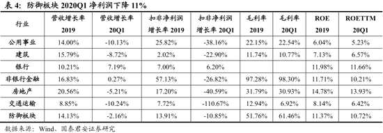 防御板塊2020Q1凈利潤下降11%,銀行、建筑、非銀金融行業(yè)盈利增速相對較高。我們將銀行、非銀金融、房地產(chǎn)、建筑、交通運輸、公用事業(yè)等盈利受宏觀經(jīng)濟影響小或有較強的平滑盈利能力的行業(yè)歸為防御板塊。2019年防御板塊營業(yè)收入同比(整體法)增長14.1%,2020Q1下降2.2%。防御板塊2019年扣非凈利潤同比增長13.9%,2020Q1下降10.9%。防御板塊2020Q1毛利率較2019年提升。分行業(yè)看,20Q1銀行、建筑、非銀金融行業(yè)盈利增速相對較高,交運、房地產(chǎn)、公用事業(yè)行業(yè)盈利下滑較多。