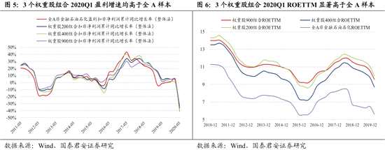 我們比較了中證100指數(shù)、中證200指數(shù)、中證500指數(shù)和中證1000指數(shù)成分股的盈利增速和ROE。從2020Q1盈利增速看,規(guī)模較大的指數(shù)成分股較規(guī)模較小的指數(shù)具有顯著優(yōu)勢,從ROE上看,規(guī)模越大的指數(shù)成分股2020Q1 ROE越高。我們剔除金融、石油石化后,自下而上構(gòu)建了3個分別包含200、400和900個成分股的權(quán)重股組合,3個組合2020Q1盈利增速均高于全A樣本,ROE同樣顯著高于全A樣本。