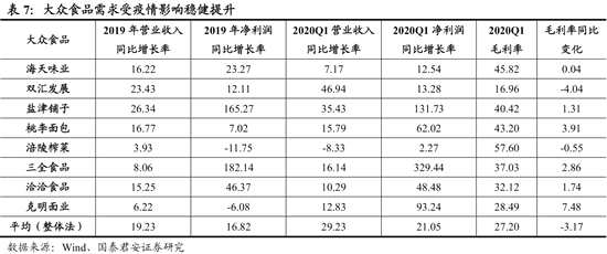 大眾食品需求受疫情影響穩(wěn)健提升,頭部公司優(yōu)勢有望繼續(xù)擴大。我們選取的8家大眾食品公司2020Q1營收同比增長29%,扣非凈利潤同比增長21%。其中三全食品、鹽津鋪子等受益于居家時間延長帶來的需求增長。而海天味業(yè)等頭部公司在餐飲行業(yè)需求沖擊下,盈利穩(wěn)健增長,顯示需求不確定性下,頭部公司優(yōu)勢有望繼續(xù)擴大。