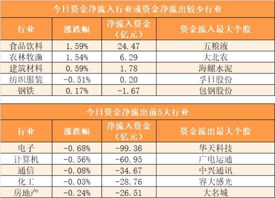 28個(gè)申萬一級行業(yè)中,4個(gè)行業(yè)實(shí)現(xiàn)資金凈流入,其中食品飲料行業(yè)凈流入24.47億元居首。