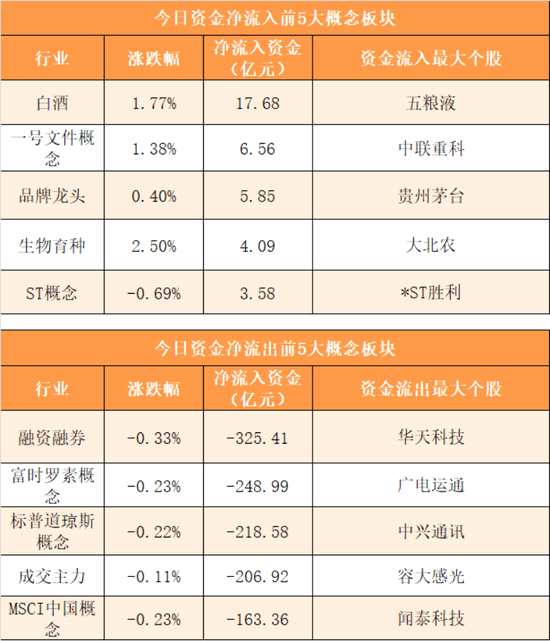 概念板塊方面,今日白酒、一號文件概念、品牌龍頭、生物育種等概念板塊資金呈現(xiàn)凈流入,其中白酒概念凈流入17.68億元居首。