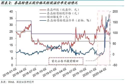 根據(jù)泰晶轉(zhuǎn)債正股泰晶科技股價(jià)走勢(shì),泰晶轉(zhuǎn)債于2020年2月3日已觸發(fā)贖回條款,但直至3月6日公司首次公告“不提前贖回泰晶轉(zhuǎn)債”,對(duì)應(yīng)的觸發(fā)時(shí)間區(qū)間為2月4日至3月6日;3月27日公司再次公告“不提前贖回泰晶轉(zhuǎn)債”,對(duì)應(yīng)的觸發(fā)時(shí)間區(qū)間為3月9日至3月27日;而5月6日公告的提前贖回提示性公告對(duì)應(yīng)的觸發(fā)時(shí)間區(qū)間為3月30日至5月6日。