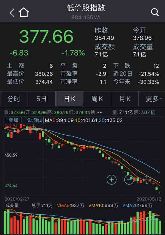 截至5月12日收盤,Wind低價股指數(shù)報377.66點,創(chuàng)歷史新低,5月份以來累計下跌7.73%,4月份累計下跌14.91%,遠遠跑輸大盤。上證指數(shù)4月份累計上漲3.99%,5月份以來累計上漲1.10%。