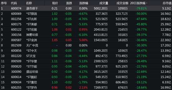 從低價股板塊內成分股來看,近二十個交易日,退市保千(維權)累計下跌79.81%,*ST銀鴿累計下跌50%,*ST兆新、*ST美都跌幅超過40%。