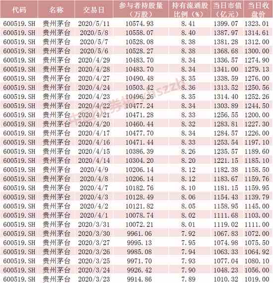 Choice數(shù)據顯示,截至3月23日收盤,北向資金持有貴州茅臺9914.86萬股,持股市值為1010.32億元,截至5月11日收盤,北向資金持有貴州茅臺10574.93萬股,持股市值已達1399.07億元,持有市值創(chuàng)歷史新高。在本輪反彈中,北向資金加倉貴州茅臺660.07萬股。