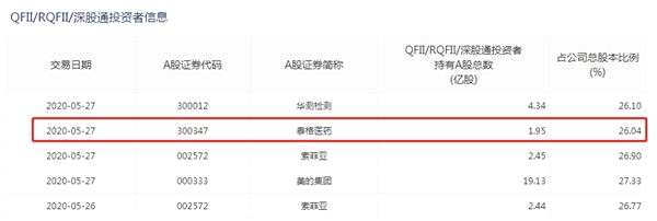 深交所數(shù)據(jù)顯示,截至5月27日,外資持有華測檢測、泰格醫(yī)藥、索菲亞和美的集團(tuán)的比例分別為26.10%、26.04%、26.90%和27.33%。根據(jù)規(guī)定,所有境外投資者對單一上市公司的A股持股比例總和,不得超過該上市公司股份總數(shù)的30%,其中26%被視為警戒線,28%則將暫停外資購買。
