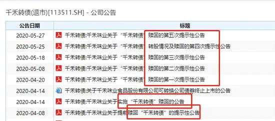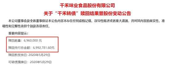 在觸發(fā)強(qiáng)贖的第二天4月9日,千禾味業(yè)就發(fā)布關(guān)于提前贖回“千禾轉(zhuǎn)債”的提示性公告,4月15日發(fā)布實(shí)施贖回的公告,4月21日、5月9日、5月19日、5月26日、5月28日又發(fā)了5次贖回提示公告。公告發(fā)布后,大部分投資者都進(jìn)行了轉(zhuǎn)股處理,然而到最后一天仍有6.96萬張轉(zhuǎn)債未轉(zhuǎn)股。