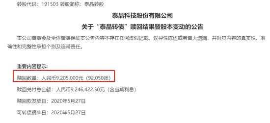 近期的網(wǎng)紅轉(zhuǎn)債泰晶轉(zhuǎn)債5月27日進(jìn)行了贖回,贖回價(jià)格為100.45元/張,5月26日最后一天交易的收盤價(jià)為125.47元,最終有9.2萬張轉(zhuǎn)債遭強(qiáng)贖,也是未轉(zhuǎn)股的,當(dāng)天泰晶轉(zhuǎn)債的轉(zhuǎn)股價(jià)值為127.37元,這些投資者一把也虧了200多萬元。