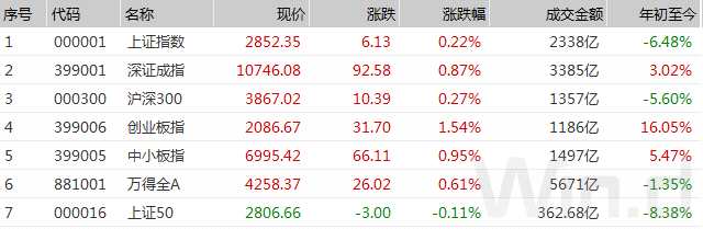 5月29日,滬深兩市小幅上漲,截至收盤,上證指數(shù)漲0.22%報(bào)收于2852.35點(diǎn);深成指漲0.87%報(bào)收于10746.08點(diǎn);創(chuàng)業(yè)板指漲1.54%報(bào)收于2086.67點(diǎn),萬得全A總成交5600多億元。