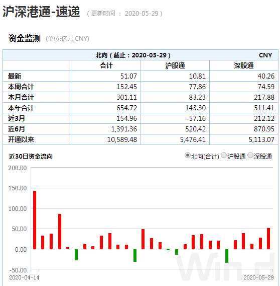 5月29日,北上資金凈流入51.07億元,本周連續(xù)5天凈流入,累計(jì)凈流入152.45億元,5月以來,北上資金累計(jì)凈流入301.11億元。