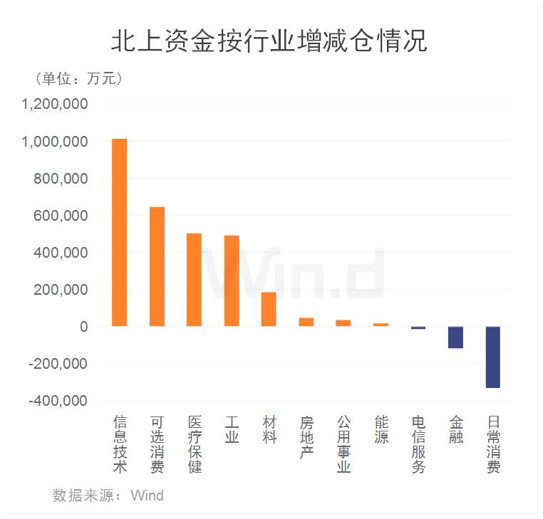 本月以來,北上資金累計(jì)凈買入300多億元。Wind統(tǒng)計(jì)顯示,從北上資金持股變動(dòng)金額行業(yè)分布來看,信息技術(shù)凈買入超過100億元,位居首位;此外,可選消費(fèi)、醫(yī)療保健、工業(yè)等板塊買入金額亦較多;僅日常消費(fèi)、金融板塊減倉幅度較大。