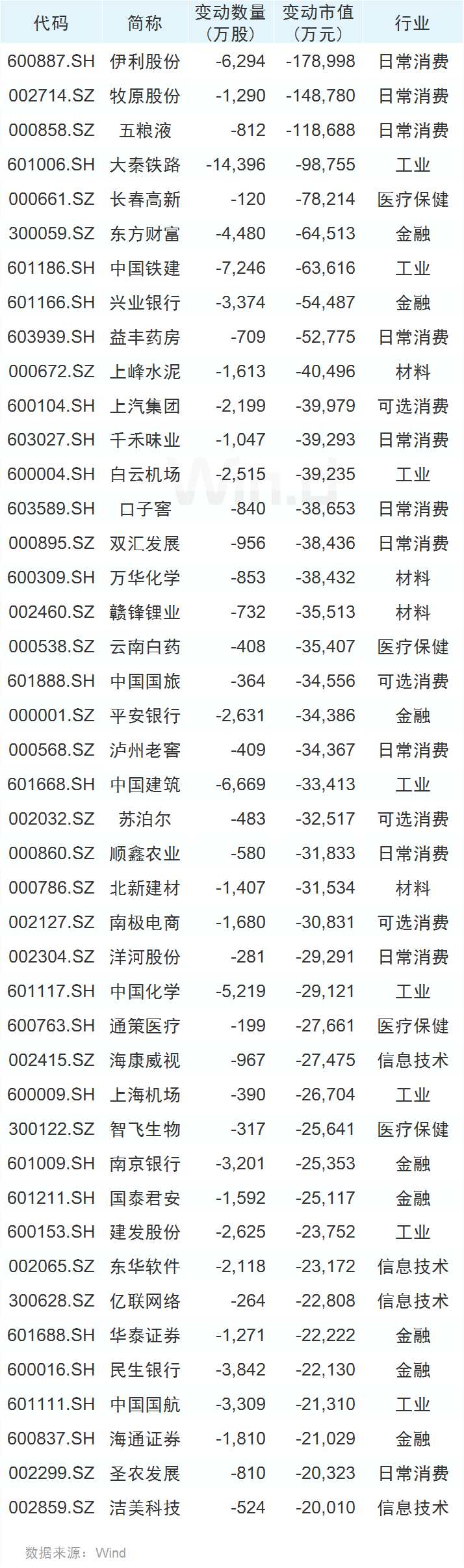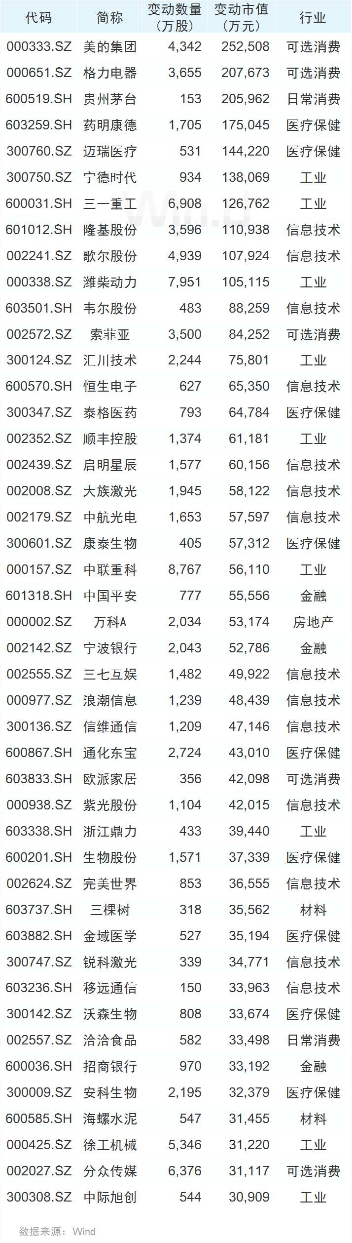 ?。ū鄙腺Y金5月28日持股與4月29日持股對(duì)比,變動(dòng)市值 = 變動(dòng)數(shù)量 X 5月28日收盤價(jià),下同)