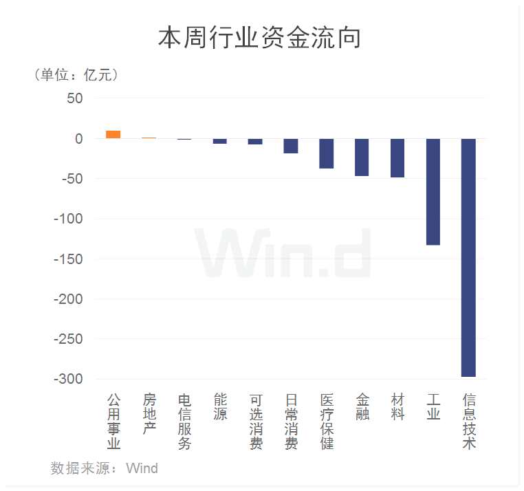 從本周行業(yè)資金流向來看,主力資金凈流出500多億元,除公用事業(yè)和房地產(chǎn)板塊小幅凈流入外,其余有板塊均呈現(xiàn)凈流出。其中,信息技術(shù)凈流出約300億元,位居首位;此外,工業(yè)板凈流出金額亦超過100億元。