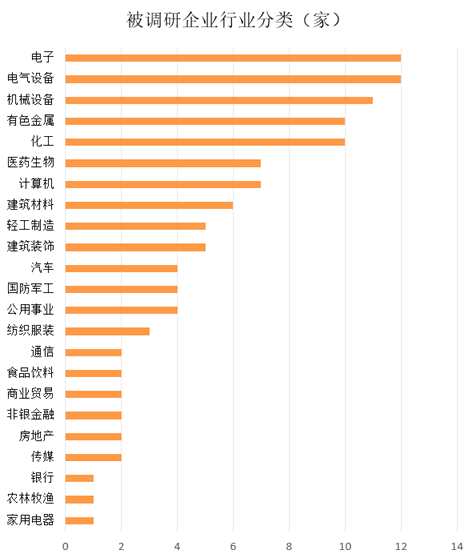 按行業(yè)分類看,上周被調(diào)研公司中,電子和電氣設(shè)備兩大行業(yè)被調(diào)研的公司數(shù)量并列首位,均有12家,機(jī)械設(shè)備行業(yè)緊隨其后,11家公司獲機(jī)構(gòu)調(diào)研。另外有色金屬、化工、醫(yī)藥生物等行業(yè)被調(diào)研的公司數(shù)量也較多。