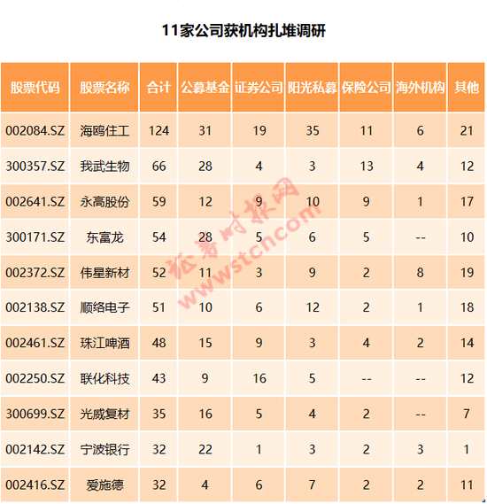 iFinD數(shù)據(jù)顯示,個股方面,海鷗住工累計(jì)接待機(jī)構(gòu)達(dá)124家,位居首位;我武生物累計(jì)接待66家機(jī)構(gòu),排名第二;【永高股份(002641)、股吧】累計(jì)接待59家機(jī)構(gòu),排名第三。