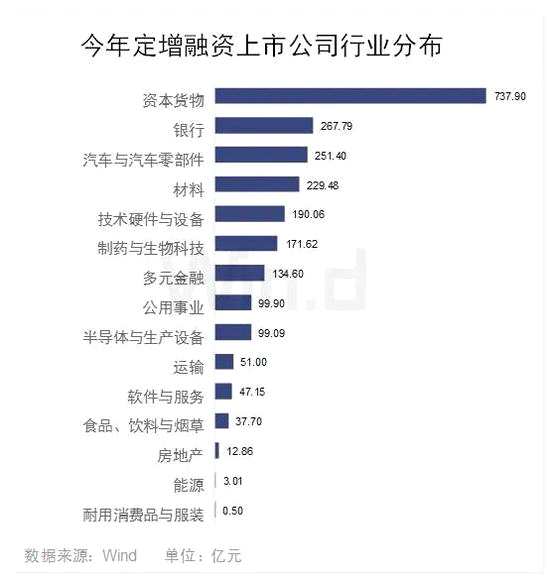 行業(yè)上看,今年以來,資本貨物行業(yè)增發(fā)規(guī)模最大,18家實(shí)際募資總額達(dá)737.9億元,平均每家超過40億。緊隨其后銀行、汽車與汽車零部件和材料行業(yè)實(shí)際融資均在兩百億元以上。另外技術(shù)硬件與設(shè)備、制藥與生物科技和多元金融三大行業(yè)融資也在百億之上,而剩余公用事業(yè)等8大行業(yè)融資稍小,均低于100億,甚至僅有數(shù)億元。