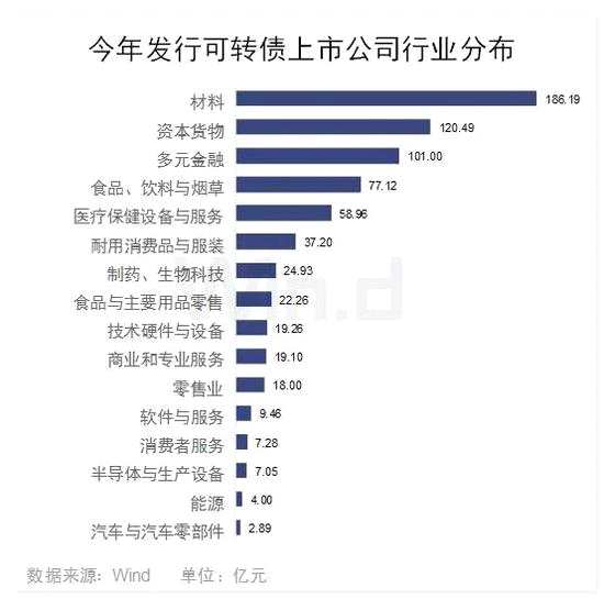 具體行業(yè)上,今年材料業(yè)發(fā)行可轉(zhuǎn)債規(guī)模最大,19家合計(jì)發(fā)行總額為186.19億,緊隨其后資本貨物和多元金融業(yè)發(fā)行額也不小,均超過100億。另外食品、飲料、醫(yī)療保健設(shè)備與服務(wù)等8大行業(yè)融資都在10億元以上。而其余軟件與服務(wù)、消費(fèi)者服務(wù)等5個行業(yè)發(fā)債融資較小,均不到10億元??梢姼餍袠I(yè)上市公司發(fā)債還是有明顯差異。