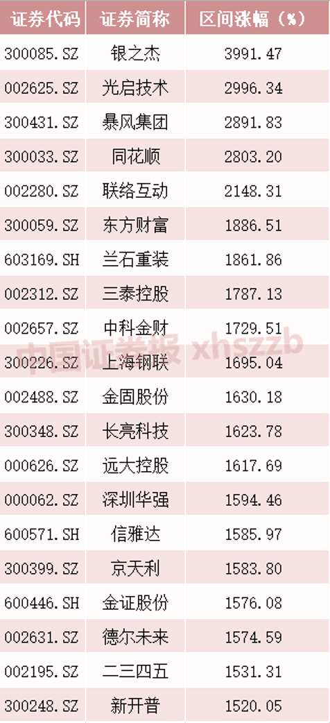 從2013年6月25日的1849點(diǎn),到2015年6月12日的5178點(diǎn),上輪牛市經(jīng)歷約2年時(shí)間,上證指數(shù)累計(jì)上漲163.15%。“如何尋找一只10倍股”是期間市場最響亮的口號(hào),Wind數(shù)據(jù)顯示,在這個(gè)時(shí)間段,兩市共誕生了70只10倍股,其中,銀之杰、光啟技術(shù)、【暴風(fēng)集團(tuán)(300431)、股吧】(維權(quán))、同花順、聯(lián)絡(luò)互動(dòng)累計(jì)漲幅超20倍。