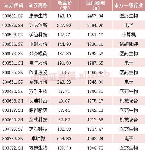 Wind數(shù)據(jù)顯示,2015年6月15日至今,兩市共誕生15只10倍股,康泰生物累計(jì)漲幅最高,為4457.04%。