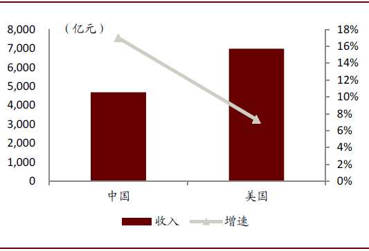 圖表: 中、美國(guó)內(nèi)快遞業(yè)務(wù)收入及增速對(duì)比(2019年)