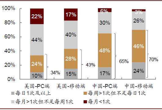 圖表: 網(wǎng)購(gòu)頻率:中美對(duì)比 (IAB調(diào)查,2016年)