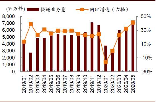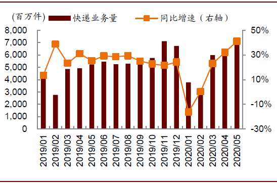 疫情之后業(yè)務(wù)量快速恢復(fù),5月增速超預(yù)期:3-5月全國(guó)快遞業(yè)務(wù)量同比增速分別為23%、32%、41%,呈現(xiàn)逐月加快的趨勢(shì),尤其是5月增速創(chuàng)2018年2月以來(lái)新高。
