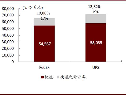 圖表:美國(guó)快遞公司產(chǎn)品品類更豐富:2018年收入構(gòu)成(快遞包括陸運(yùn)和空運(yùn))
