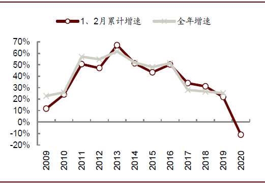 圖表: 受疫情影響,1-2月份快遞業(yè)務(wù)量合計(jì)增速較去年同期放慢32個(gè)百分點(diǎn)