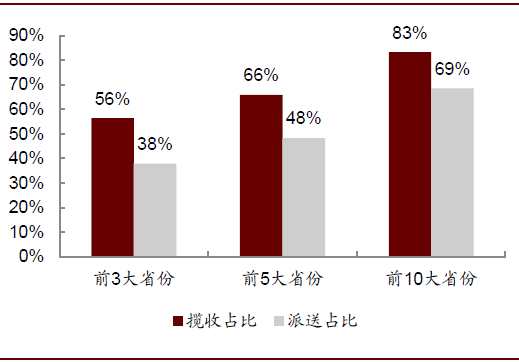 注:業(yè)務(wù)量(攬收量)基于2019年數(shù)據(jù),攬派比數(shù)據(jù)基于2015年(其后未更新),與實(shí)際情況有誤差,但我們認(rèn)為攬派比數(shù)據(jù)變動(dòng)幅度可能相對(duì)較慢,因此仍具有一定代表性 資料來(lái)源:國(guó)家郵政局,中金公司研究部