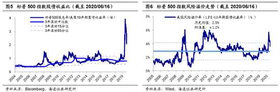目前美股估值高盈利弱,靠零利率支撐。3月23日以來美股迎來強(qiáng)勢反彈,代表性指數(shù)納斯達(dá)克指數(shù)創(chuàng)歷史新高,最大漲幅為52.1%,標(biāo)普500和道瓊斯指數(shù)也逼近2月高點(diǎn),最大漲幅分別為47.5%和51.4%。從絕對估值看,歷史上標(biāo)普500指數(shù)早期PE處于低位,在1929-1990年期間標(biāo)普500PE均值為14倍,波動區(qū)間是6~26倍,進(jìn)入90年代后,美股估值中樞開始提升,平均達(dá)21倍,剔除短暫的互聯(lián)網(wǎng)泡沫階段,核心波動區(qū)間是12~25倍,截止2020/6/16,標(biāo)普500指數(shù)PE(TTM)為20.8倍,處于05年以來自下而上86%歷史分位。從盈利趨勢看,市場不斷降低美股盈利預(yù)期,根據(jù)彭博一致預(yù)期,標(biāo)普500指數(shù)2020年預(yù)測凈利潤同比從年初的19.1%下調(diào)至當(dāng)前的-5.3%,納斯達(dá)克綜合指數(shù)從24.2%下調(diào)至0.8%,道瓊斯工業(yè)指數(shù)從22.1%下調(diào)至-9.8%??梢?,目前美股估值偏高而盈利趨勢向下,然而美股依舊大幅反彈,我們認(rèn)為當(dāng)前美股有點(diǎn)“虛高”,背后的關(guān)鍵是零利率政策。今年3月3日和3月16日美聯(lián)儲連續(xù)降息至0%-0.25%區(qū)間,并啟動7000億美元量化寬松計(jì)劃。早在《美股長牛背后的結(jié)構(gòu)差異-20200225》中,我們指出在極低的利率水平下,美股的相對估值并不高。首先從風(fēng)險(xiǎn)溢價(jià)率來看,歷史數(shù)據(jù)顯示1953-1992年期間這一指標(biāo)持續(xù)下滑,標(biāo)普500風(fēng)險(xiǎn)溢價(jià)率從1953年的7.5%一路降至1992年的-3.6%,此后開始回升,2003年11月風(fēng)險(xiǎn)溢價(jià)率由負(fù)轉(zhuǎn)正,最高在2011年9月達(dá)到6.0%,此后開始高位震蕩,截至2020/6/16,標(biāo)普500指數(shù)風(fēng)險(xiǎn)溢價(jià)率為4.1%,高于歷史均值水平2.8%,處于05年以來從低到高的85%分位。其次從股債資產(chǎn)比價(jià)角度看,標(biāo)普500指數(shù)最近12個月股息率/美國10年期國債收益率作為股債比價(jià)指標(biāo),截至2020/6/16,這個指標(biāo)已升至2.85(處于近3年自下而上81%分位),說明股債比價(jià)角度看,美股明顯優(yōu)于美債,流動性充裕的背景下資金流入股市。