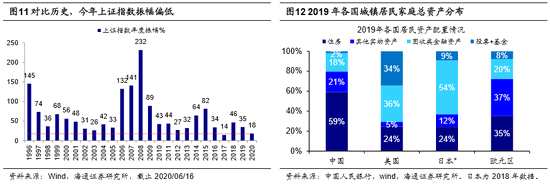 A股估值低位、資金充裕,市場空間看盈利。今年以來上證綜指漲跌幅為-3.9%,滬深300為-2.0%,創(chuàng)業(yè)板指為25.7%,期間市場經(jīng)歷了新冠肺炎疫情爆發(fā)和蔓延,但市場整體走勢并不弱,大盤指數(shù)呈現(xiàn)區(qū)間盤整的特征。從漲跌時間看,今年以來市場下跌交易日共計(jì)21天,占比20%,而上漲交易日共計(jì)86天,占比為80%。可見,市場表現(xiàn)為急跌慢漲,這是牛市強(qiáng)勢的特征之一。中期角度看,我們一直提出19年1月4日上證綜指2440點(diǎn)開啟新一輪牛市,上證綜指2440-3288點(diǎn)是牛市1浪上漲,3288點(diǎn)以來是牛市2浪回調(diào),在疫情沖擊下2浪被拉長。疫情不改牛市趨勢,但改變了牛市節(jié)奏。上證綜指2646點(diǎn)大概率是牛市2浪調(diào)整的最低點(diǎn),目前處于底部區(qū)域的區(qū)間震蕩,為牛市3浪的上漲蓄勢,等基本面重新回升,牛市3浪上漲重啟。目前A股估值處在歷史低位,我們認(rèn)為3月19日上證綜指2646點(diǎn)是牛市2浪調(diào)整的底部區(qū)域:第一恐慌底,當(dāng)時投資者擔(dān)憂08年金融危機(jī)重現(xiàn),目前看全球貨幣政策寬松,金融危機(jī)概率很小,而且這次基本面背景跟08年不同,詳見《現(xiàn)在與08年的異同——新冠肺炎研究系列5-20200325》。第二政策底,3月19日2646點(diǎn)后,3月22日國新辦舉行一行兩會一局新聞發(fā)布會,向外界傳遞了穩(wěn)金融的信號,類似18年10月19日一行兩會負(fù)責(zé)人發(fā)聲穩(wěn)定金融市場。第三估值底,從PE/PB、股債收益比等角度前文已經(jīng)分析A股較具吸引力,這吸引著大量資金入市。今年以來偏股型基金已發(fā)行5818億份,前5個月月均1106億份,而19年全年才4700億份,月均僅有397億份。資金入市背后的大邏輯,居民資產(chǎn)配置逐漸轉(zhuǎn)向權(quán)益。對比海外,我國配置權(quán)益資產(chǎn)的比例很低。2019年美國居民配置權(quán)益類資產(chǎn)的比例為34%,住房為24%,歐元區(qū)為8%、35%,日本2018年的數(shù)據(jù)為9%、24%,我國僅為2%、59%。今年以來上證指數(shù)年均值為2903點(diǎn)、振幅為18.1%,而1996年以來年度振幅中位數(shù)為45.1%,歷史上低位在25%左右,對比歷史今年市場上下振幅太低,未來中樞上移擴(kuò)大振幅還是下移擴(kuò)大振幅,取決于估值狀況和盈利增長。