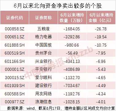 Wind數(shù)據(jù)顯示,截至6月17日,本月以來北向資金凈賣出五糧液26.78億元,凈賣出格力電器19.54億元,凈賣出貴州茅臺7.95億元,對愛爾眼科的減持金額也超過4億元。