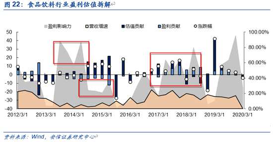 ■對(duì)于食品飲料而言,2015年?duì)I收增速雖然未見(jiàn)改善,但市場(chǎng)對(duì)于估值的偏好度提升,盈利影響力快速下降,食品飲料得以跟漲。2017年至2018年期間,食品飲料行業(yè)的高增長(zhǎng)伴隨著較高的盈利影響力,使得食品行業(yè)在這兩年間獲得了較高的漲幅。