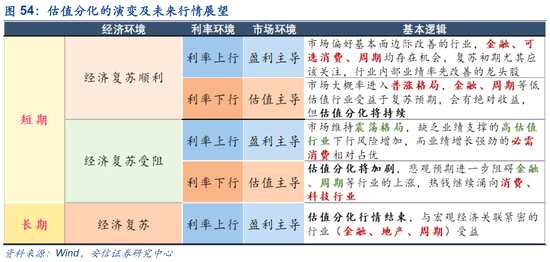我們從經(jīng)濟(jì)周期的視角出發(fā),當(dāng)在經(jīng)濟(jì)位于底部時(shí),央行為了提振經(jīng)濟(jì)而采取寬松的貨幣政策,同時(shí)衰退的經(jīng)濟(jì)環(huán)境使得企業(yè)的盈利不斷下滑,股票價(jià)格更多體現(xiàn)了市場(chǎng)對(duì)企業(yè)基本面邊際改善的預(yù)期,成長(zhǎng)性強(qiáng)的和盈利穩(wěn)定的行業(yè)估值上行,從而發(fā)生估值分化;隨著經(jīng)濟(jì)的復(fù)蘇,企業(yè)盈利不斷提升,在復(fù)蘇的早期,貨幣政策保持寬松對(duì)應(yīng)著企業(yè)估值的提升,市場(chǎng)進(jìn)入估值盈利雙輪驅(qū)動(dòng)的牛市,估值分化現(xiàn)象迎來(lái)拐點(diǎn)。此后,經(jīng)濟(jì)重新進(jìn)入增長(zhǎng)期,通脹率開(kāi)始攀升,因此貨幣政策逐漸收緊,市場(chǎng)對(duì)于企業(yè)基本面的關(guān)注度也逐漸提高,估值的影響開(kāi)始減小,市場(chǎng)由盈利主導(dǎo),與經(jīng)濟(jì)關(guān)聯(lián)度高的低估值行業(yè)估值快速上行,估值分化隨之結(jié)束。直到經(jīng)濟(jì)到達(dá)頂峰后再次進(jìn)入衰退階段,貨幣再次寬松,盈利再次下滑,企業(yè)的估值影響才再次主導(dǎo)市場(chǎng)。