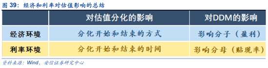 綜合2012年至今的估值分化行情后,我們認(rèn)為在DDM模型中,經(jīng)濟(jì)-利率的脈絡(luò)與A股估值分化的關(guān)系并不始終一致,同時(shí)與盈利主導(dǎo)和估值主導(dǎo)之間的關(guān)系是復(fù)雜的,但是依然大致可以得出如下結(jié)論:利率的趨勢(shì)性變化決定估值分化的起始和結(jié)束的時(shí)間節(jié)點(diǎn),盈利主導(dǎo)和估值主導(dǎo)的切換信號(hào)主要是市場(chǎng)利率;經(jīng)濟(jì)環(huán)境的變化影響了分化開(kāi)始以及分化結(jié)束的方式。