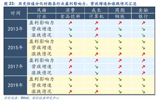 在歷史上的三次估值分化過(guò)程中,類(lèi)似估值分化往往代表著其背后業(yè)績(jī)趨勢(shì)的改變。在這里,我們采用四個(gè)風(fēng)格的代表行業(yè)(消費(fèi):食品飲料、周期:鋼鐵、成長(zhǎng):計(jì)算機(jī)、金融:銀行)作為研究對(duì)象來(lái)說(shuō)明這個(gè)問(wèn)題。下面的一組圖中,我們以營(yíng)收增速作為基本面指標(biāo),行業(yè)的PE或PB的三年歷史分位數(shù)作為估值指標(biāo)。不難發(fā)現(xiàn),拉長(zhǎng)來(lái)看四個(gè)行業(yè)幾次較為明顯的估值分化基本上背后的業(yè)績(jī)趨勢(shì)也是明顯分化的,在時(shí)間點(diǎn)上是高度重合的。當(dāng)然,也有存在由于當(dāng)期基本面惡化或者大幅改善導(dǎo)致估值被動(dòng)抬升和被動(dòng)下降的時(shí)候,但基本存在時(shí)間較短,市場(chǎng)對(duì)于估值的糾偏是迅速且有效的。