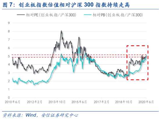 從風(fēng)格的視角來(lái)看,創(chuàng)業(yè)板指數(shù)/滬深300指數(shù)相對(duì)估值相當(dāng)于2013年下半年,離歷史極值依然存在一定空間。但僅僅從這個(gè)數(shù)據(jù)來(lái)看當(dāng)前A股估值分化并不嚴(yán)謹(jǐn)。一方面,在全球疫情的背景下,當(dāng)前A股估值分化格局雖然并不難理解,但內(nèi)部是復(fù)雜的,不能簡(jiǎn)單用風(fēng)格視角來(lái)解釋。區(qū)別于2013年以創(chuàng)業(yè)板為代表的科技成長(zhǎng)行情表現(xiàn)為風(fēng)格屬性偏強(qiáng),2019年至今消費(fèi)、科技整體估值偏高,而金融和周期板塊普遍偏低則體現(xiàn)為行業(yè)屬性偏強(qiáng)。另一方面,創(chuàng)業(yè)板指數(shù)/滬深300指數(shù)采用絕對(duì)估值相比,會(huì)使得與歷史極值的空間存在誤導(dǎo)性。在牛市或者熊市行情中絕對(duì)估值分化的參考意義其實(shí)不大,只有在結(jié)構(gòu)性行情中的作用會(huì)相對(duì)明顯。因此,采用絕對(duì)估值相比作為分化指標(biāo)衡量,往往會(huì)低于牛市行情時(shí)的極高值,同時(shí)會(huì)高于熊市行情時(shí)的極小值,有可能產(chǎn)生刻舟求劍的誤導(dǎo)。