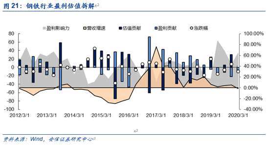 ■對(duì)于鋼鐵行業(yè)而言,周期屬性使得其估值波動(dòng)的邏輯有所不同,可以發(fā)現(xiàn)與其他行業(yè)不同的是,鋼鐵行業(yè)的估值貢獻(xiàn)和盈利貢獻(xiàn)往往互相牽制,這和投資者普遍認(rèn)為周期行業(yè)的高增速是周期接近頂部的標(biāo)志有關(guān)。因此,鋼鐵行業(yè)的營(yíng)收增速與估值的背離也不難理解。