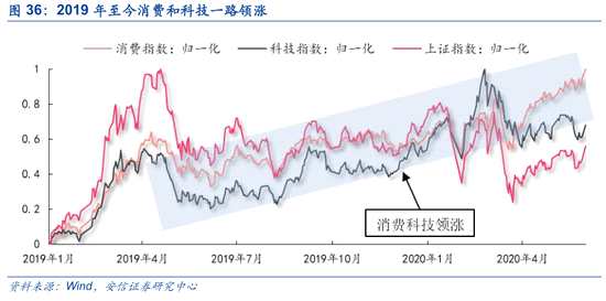 2019年至今,由于經(jīng)濟(jì)增速持續(xù)下滑疊加疫情影響和貿(mào)易摩擦的反復(fù),市場(chǎng)情緒轉(zhuǎn)向悲觀,金融和周期分別下跌4.20%和8.77%,估值更是跌去了20%以上。與此同時(shí),不斷下降的利率保證的市場(chǎng)充裕的流動(dòng)性,資金開(kāi)始向業(yè)績(jī)預(yù)期穩(wěn)定的消費(fèi)或成長(zhǎng)性較好的科技行業(yè)集中,消費(fèi)和周期同期上漲26.09%和17.91%,PE漲幅分別為25.04%和15.86%,從而導(dǎo)致了估值分化的產(chǎn)生。