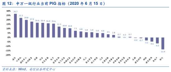 就當(dāng)前A股估值,“殺估值”和“抬估值”背后蘊(yùn)含的基本面預(yù)期也出現(xiàn)明顯的分化。在這里,我們引入PIG(價(jià)格隱含增長(zhǎng)率)進(jìn)行觀察,在全球疫情的背景下,市場(chǎng)預(yù)期成長(zhǎng)行業(yè)將以20%左右的增速增長(zhǎng),而對(duì)于金融、地產(chǎn)和周期行業(yè),市場(chǎng)則預(yù)期以負(fù)增速增長(zhǎng),銀行的預(yù)期增速低至-13.4%。(PIG是連接估值和基面的重要指標(biāo),表示在當(dāng)前估值水平下未來(lái)10年平均業(yè)績(jī)?cè)鲩L(zhǎng)幅度。)