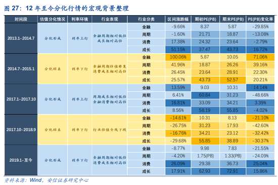 從A股估值分化指標(biāo)來(lái)看,2012年至今A股經(jīng)歷了三次顯著的估值分化階段,分別是2013-2015年成長(zhǎng)估值明顯占優(yōu),2017-2018年消費(fèi)、金融估值相對(duì)占優(yōu)以及2019年至今成長(zhǎng)和消費(fèi)估值明顯占優(yōu)。在這三段估值分化過(guò)程中,對(duì)應(yīng)著其不同的經(jīng)歷和利率環(huán)境。